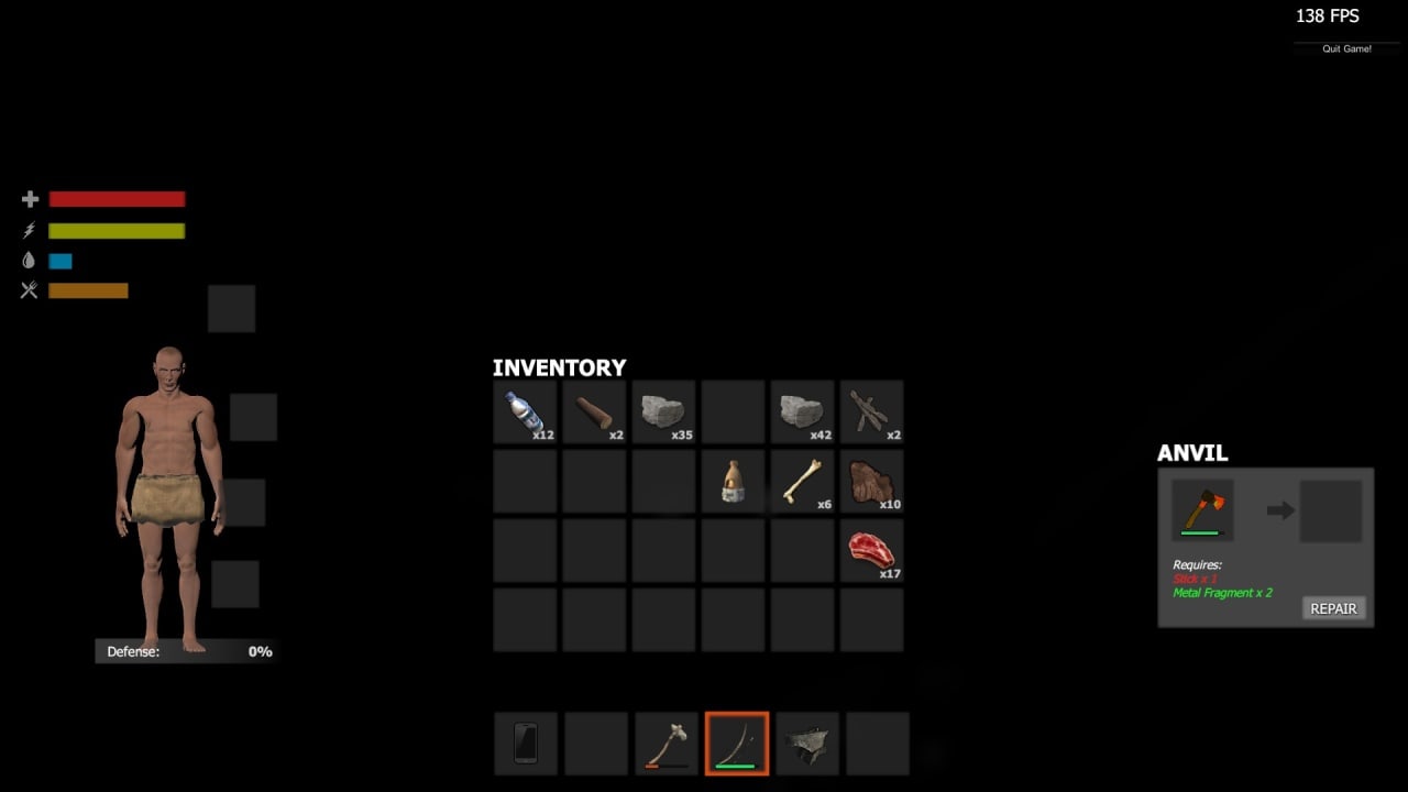 По состоянию готовности проект находится на стадии альфы. Доступен только одиночный режим. Процесс сохранения прогресса не отлажен нормально. Предметов не так много, возможностей мало, количество монстров скромное. В списке названий для крафта нет разделения по типам. Например: радиоприемник соседствует с деревянной кроватью и примитивной плавильной печью.
